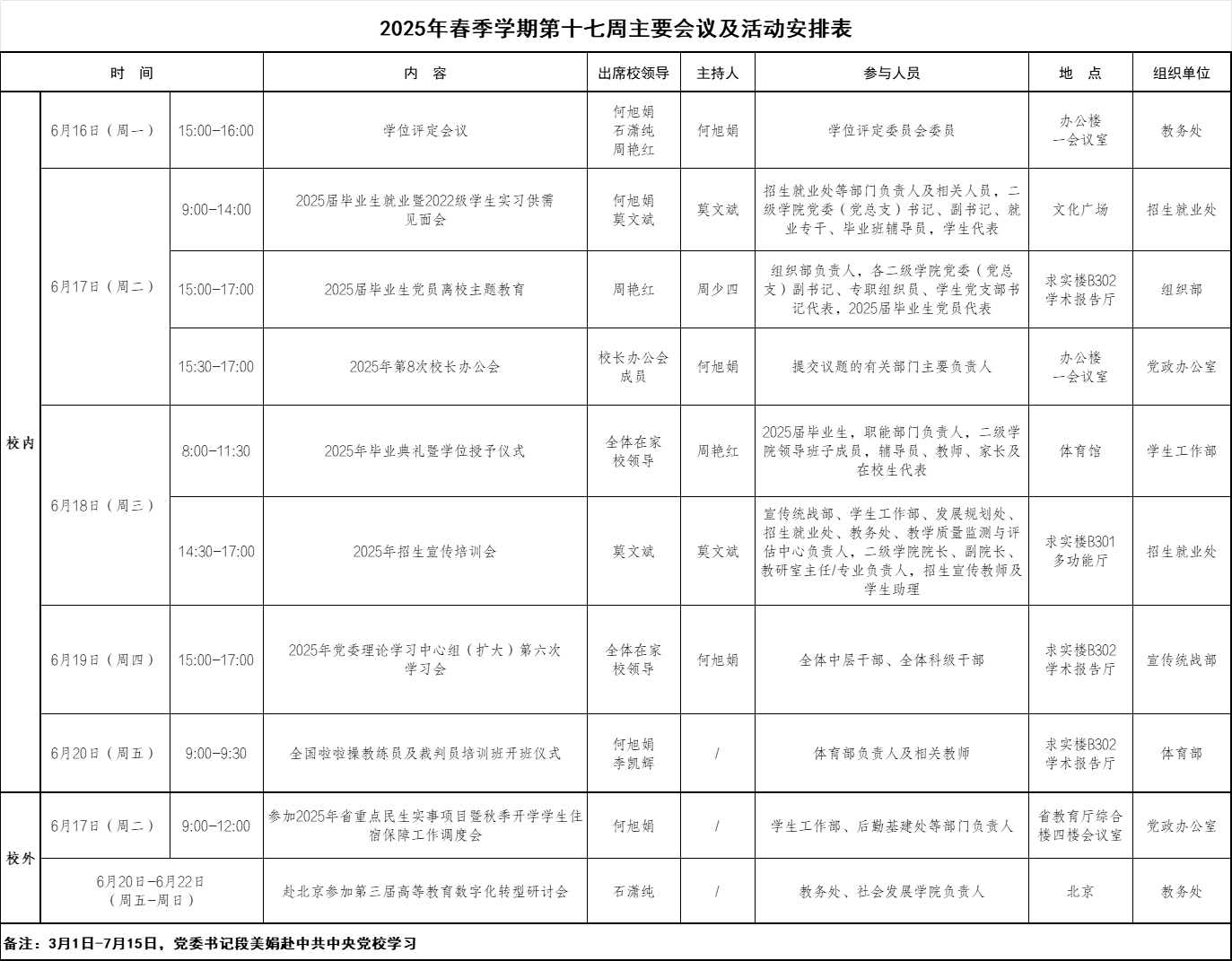 2025年春季学期第十七周主要会议及活动安排