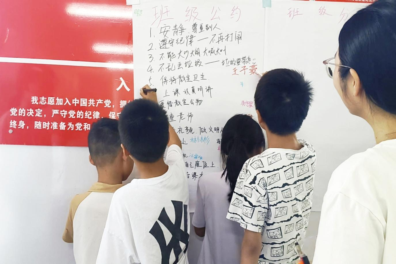 为了帮助孩子们培养良好的社会情感意识,团队将把六天班级管理权交给孩子们,引导他们主动参与、积极思考,自主制定班级公约和班级分工。甜甜同学非常开心她提议的“绿植委员”职务得到大家的认可。