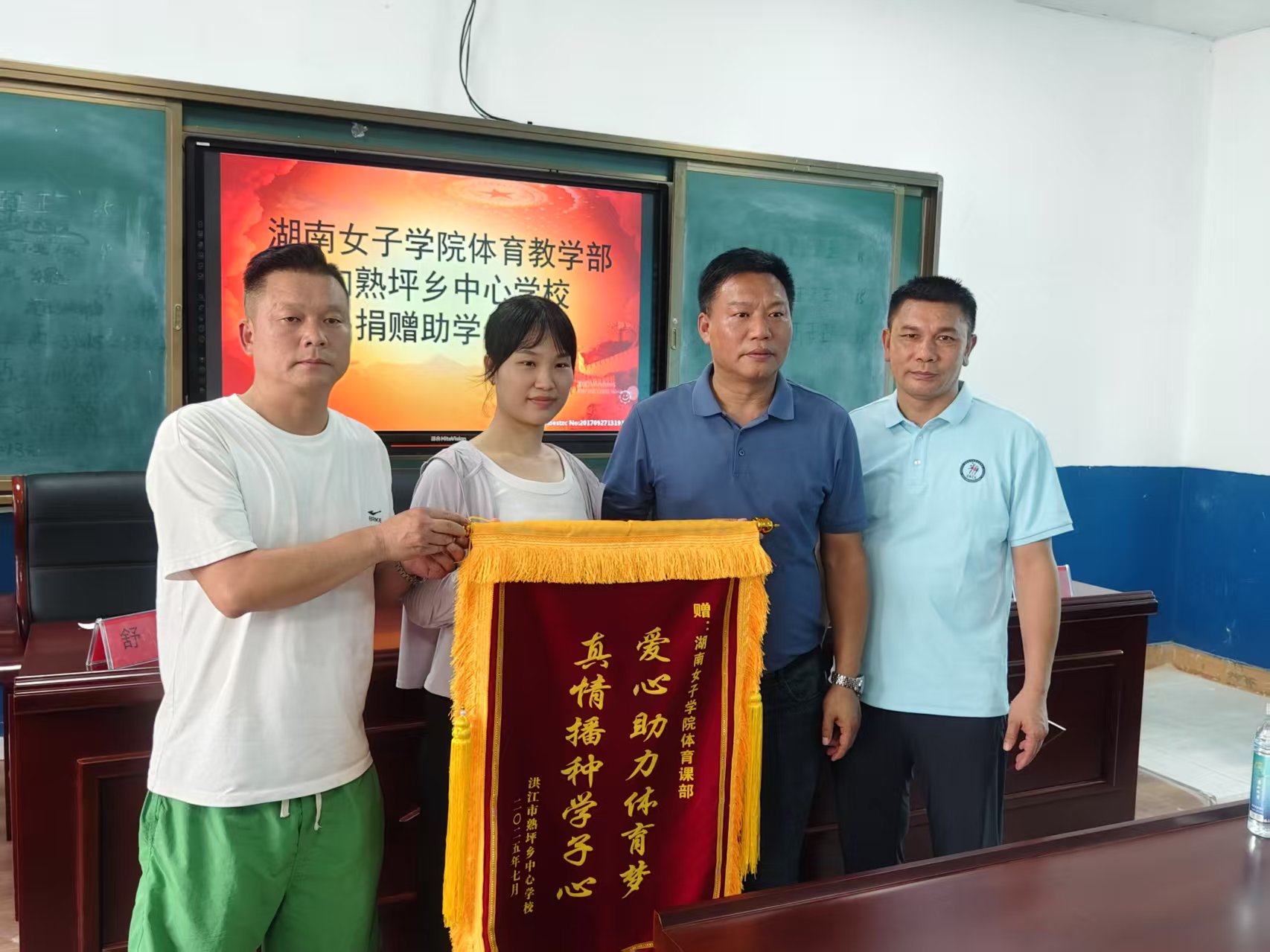 捐赠结束后,熟坪乡中心学校向pg娱乐电子游戏官网入口体育部回赠了一面写有 “爱心助力体育梦 真情播种学子心” 的锦旗。锦旗上的话语饱含着学校师生对pg娱乐电子游戏官网入口体育部的深深感激之情,也象征着双方在推动乡村体育教育事业发展上建立起的深厚情谊。