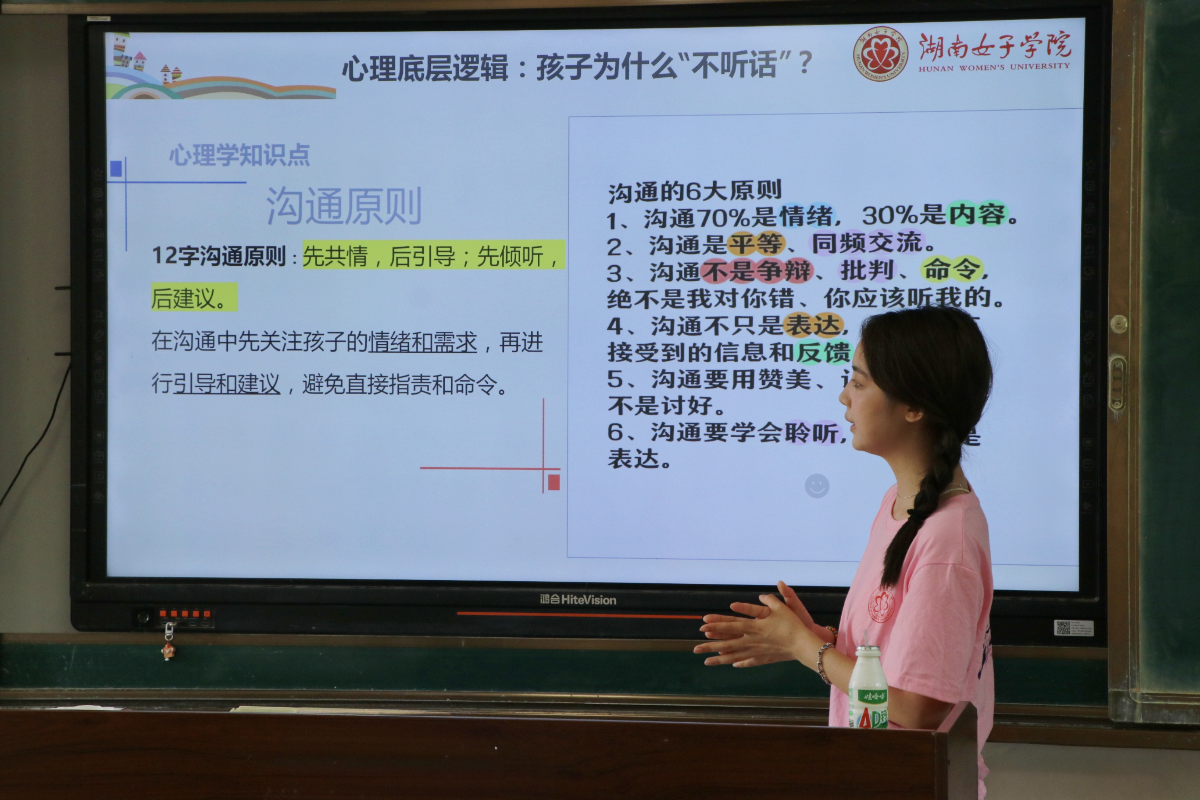 主讲人李思媛结合心理学理论和真实案例,深入剖析孩子内心密码,重点讲解了“一停二看三说”沟通急救法和“彩虹屁夸夸法”。由妈妈们进行角色扮演和角色互换,结合讲授的方法,进行模拟互动沟通,现场取得了良好的反响。同时实践团成员还分享了pg娱乐“女性与家庭”教育中总结的“共情沟通法”“约定沟通法”等小妙招。刘妈妈捧着记满笔记的本子笑开了花:“这些法子一听就懂、一学就会,以后跟娃说话不愁啦!”