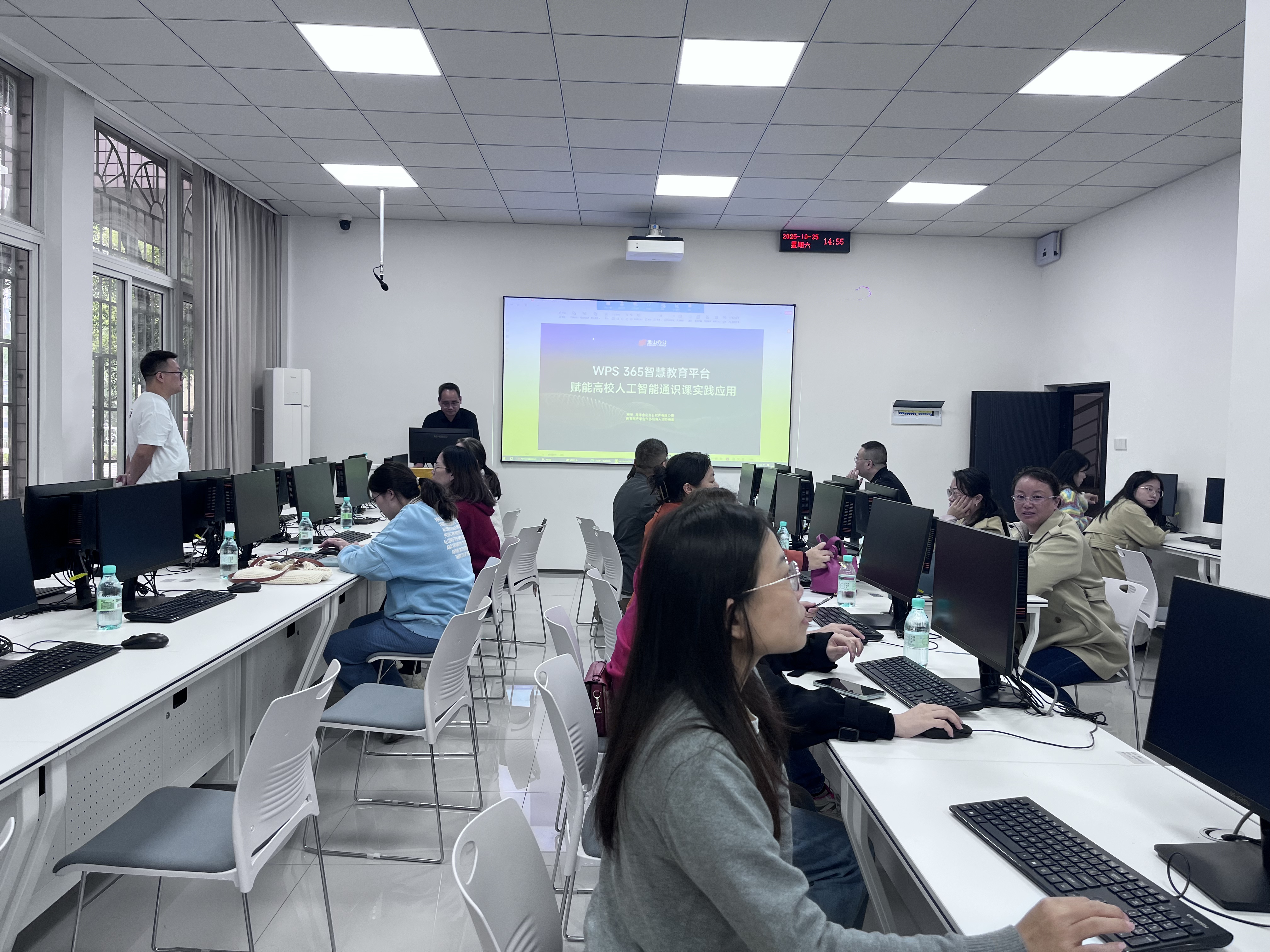 本次培训由珠海金山办公专家邓华主讲,围绕“WPS AI教学场景实操”、“AI实训室应用”展开,涵盖AI工具课堂落地、学情分析等内容,通过理论讲解与实操演练结合的方式,帮助教师掌握技术应用方法。培训现场,跨教研室、跨校教师互动热烈。大家纷纷表示,培训内容紧贴教学场景、实操性强,通过实操体验WPS AI在课件生成、作业批阅、学情反馈中的高效应用,深刻感受到技术对教学减负增效的切实价值。参训的《大学信息技术》任教教师普遍反映,这类实操性强的培训不仅增强了人工智能技术应用信心,还为未来课程向人工智能通识课变革提供了可落地的教学解决方案。