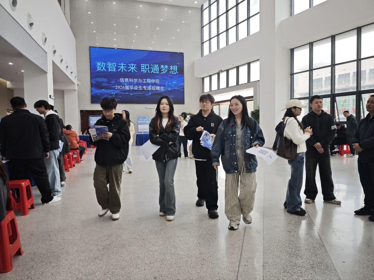 本网讯(信息科学与工程学院 颜淑兰 侯懿轩)10月31日,信息科学与工程学院在求实楼成功举办2026届毕业生专场招聘会,以精准对接服务助力学子高效就业。本次活动汇聚40余家行业标杆企业,释放2000余个优质岗位,岗位涵盖软件开发、算法研发、数据分析、网络安全等多个领域,高度适配学院学科优势,吸引数百名毕业生踊跃参与,现场求职氛围热烈浓厚。