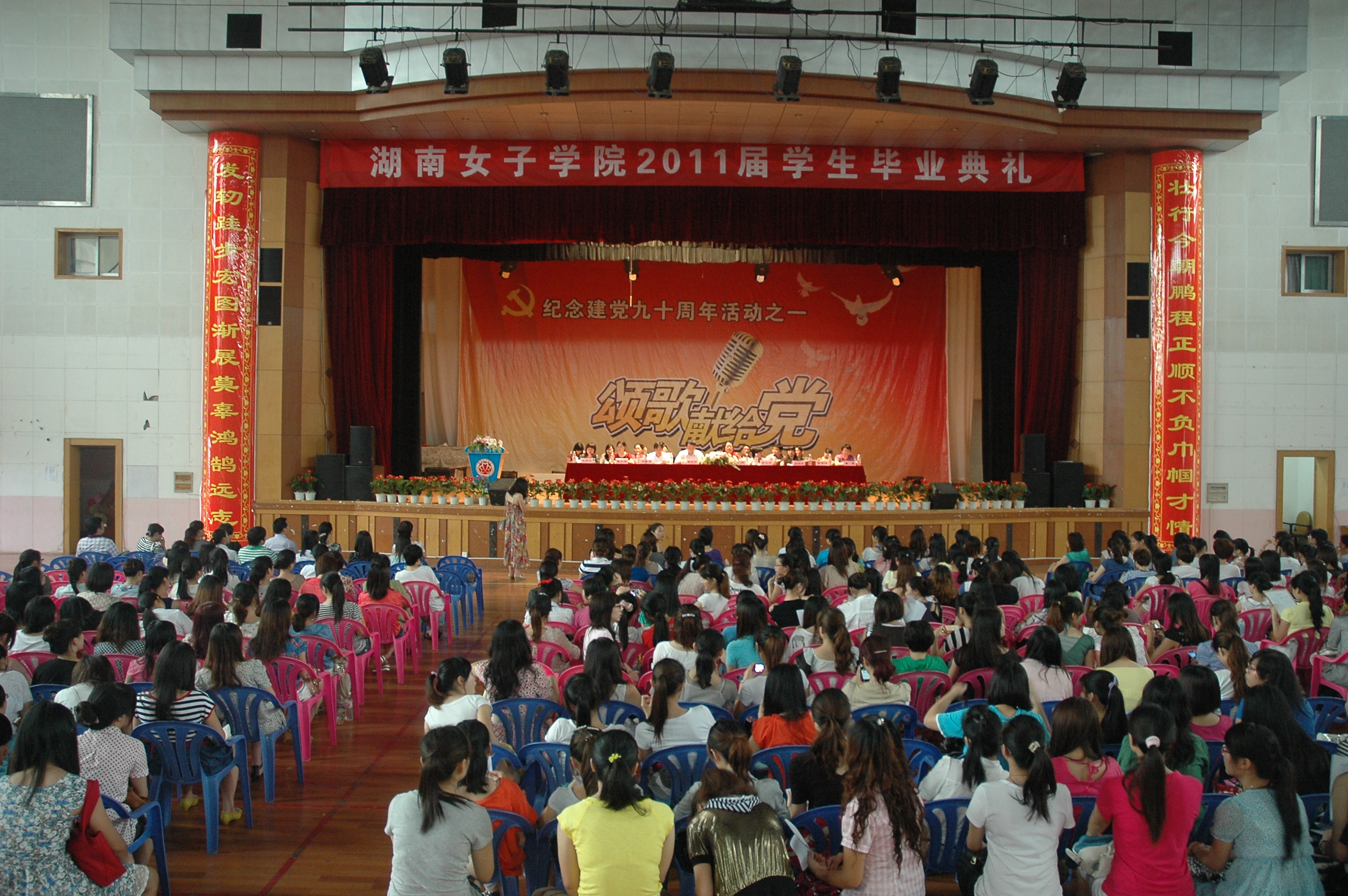 毕业生代表、在校生代表和教师代表先后上台发言。代表们共同回顾了自己和学校共同成长的历程,畅谈了感人至深的姐妹和师生情谊,表示要牢记校训,努力学习和工作,为学校争光。副校长周美林宣读了关于表彰48名省级优秀毕业生和228名校级优秀毕业生的决定。在高昂的乐曲中,校领导向毕业生们颁发了荣誉证书和毕业证书。随后,全体毕业生向学校敬献上一块名为《报喜图》的湘绣匾,共同祝愿学院喜事连连,前程似锦。