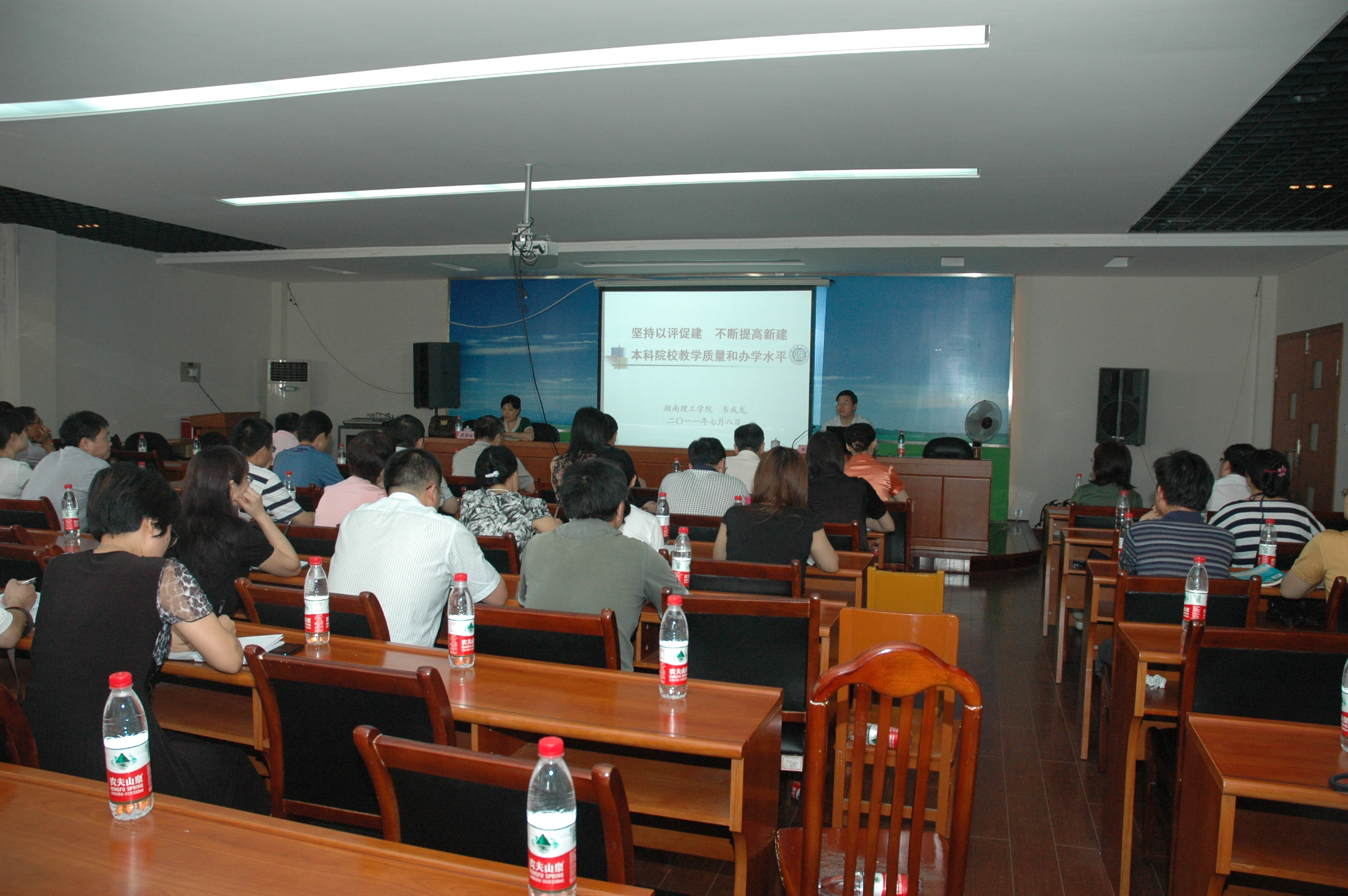 7月8日下午,湖南理工学院校长韦成龙教授应邀来pg娱乐作报告。报告主题为“坚持以评促建,不断提高新建本科院校教学质量和办学水平”。校党委书记易银珍主持报告会。 报告分四个部分:本专科教育差异的对比分析、新建本科院校的主要特点和问题、本科教学工作合格评估的基本思想、新建本科院校的内涵提升。在第一部分,韦成龙校长着重讲述了本专科教育在办学层次、学校定位、教育观念、人才培养目标、师资配置、学科专业建设、课程体系与教学内容、教学方法等方面的差异性,并进行了对比分析。在第二部分,韦成龙校长谈到了新建本科院校在数量、组建基础、布局、人才培养、服务面、队伍来源等方面的主要特点,并详细剖析了新建本科院校普遍存在的问题:办学定位不准;新专业高速扩张,比例太高;教学经费不足;教师队伍结构不合理;教学管理力量薄弱;主管部门指导与管理不到位等。在第三部分,韦成龙校长用大量的数据和案例分析了首轮本科教学工作合格评估取得的巨大成绩以及问题与不足,为我们详细介绍了新的评估理念、新建院校合格评估方案设计思想、指标体系的新变化、评估的主要环节、评估的主要技术手段和方式等。在第四部分,韦成龙校长针对新建本科院校的内涵提升提出了8点建设性意见,即打造办学特色,强化师资队伍建设,提升教师队伍综合素质,以学科专业建设为龙头、夯实和巩固办学基础,以教学为中心、大力提升教学质量,加强管理队伍建设,加强科学研究,加强校园文化建设。
