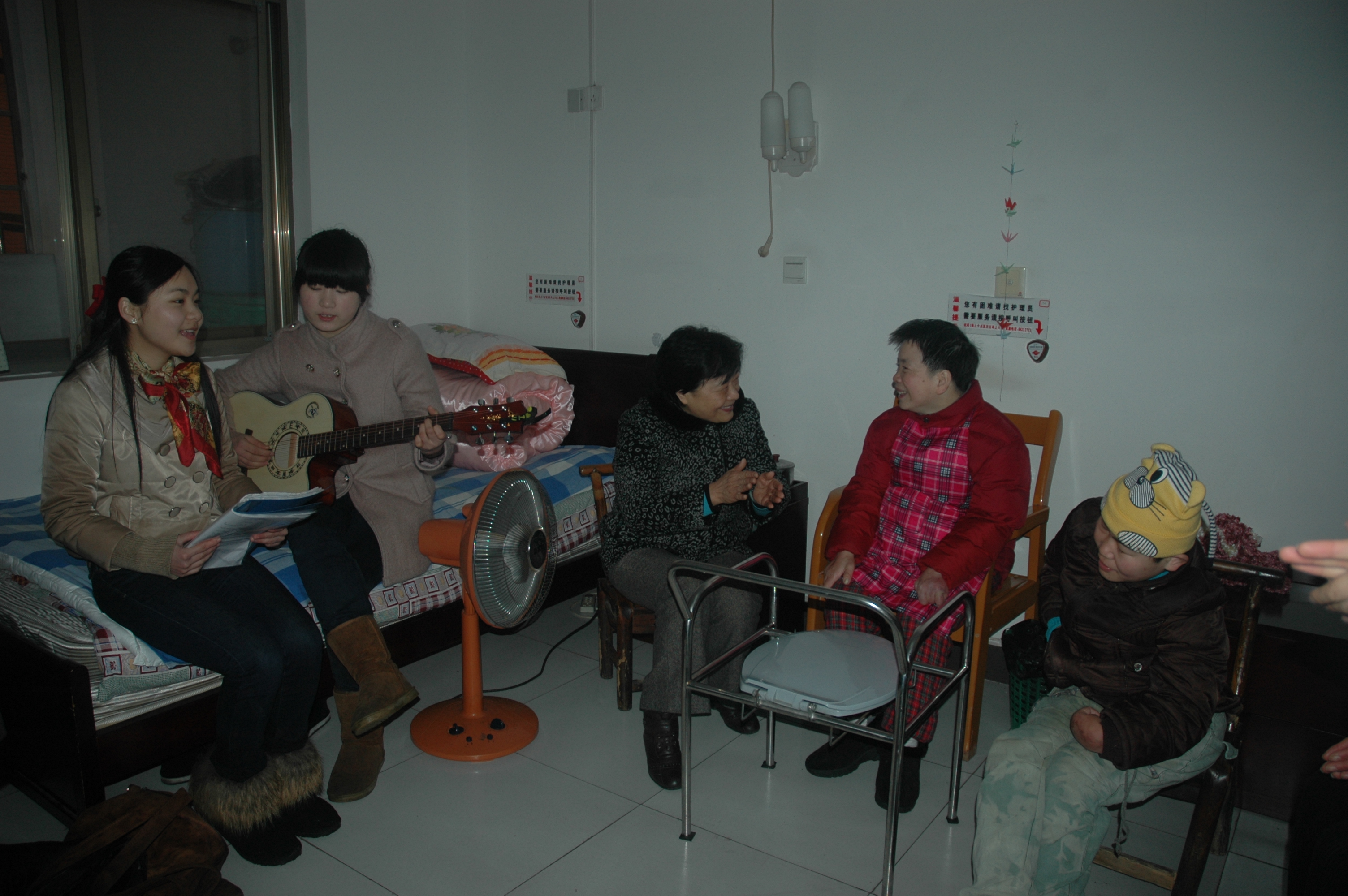 在工作人员的陪同下,易书记和党员教师分组带领学生走进“三无五保人员”的住处,“一对一”陪老人聊天,给老人们送来温暖。在残疾老人欧阳俊兰和脑瘫患者刘振萍的房间里,易书记紧紧拉着她们的手,详细询问了她们的生活情况和身体状况,耐心地为她们整理衣帽、搓手捶腿,亲切地与她们拉家常,鼓励她们保持乐观自信、健康快乐生活,学前教育专业的学生自弹自唱,表演了精彩的文艺节目,给老人们带来了欢笑。慰问活动进行了将近两个小时,虽然天气寒冷,但福利中心的老人们都非常开心,空气中充满着爱的暖流。临走前,易书记带领党员教师纷纷解囊,向雨花区社会福利中心捐赠了一笔“爱心款”以帮助改善老人们的饮食生活,还多次叮嘱老人们要保重身体,安享晚年,老人们对慰问人员依依不舍。