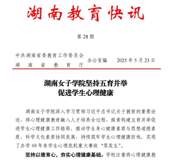 本网讯(学工部 李满林)5月23日,由中共湖南省委教育工作委员会、湖南省教育厅办公室编的《湖南教育快讯》第28期刊发《pg娱乐电子游戏官网入口坚持五育并举 促进学生心理健康》专题报道,在全省推介pg娱乐坚持五育并举,促进学生心理健康的举措、经验和成效。