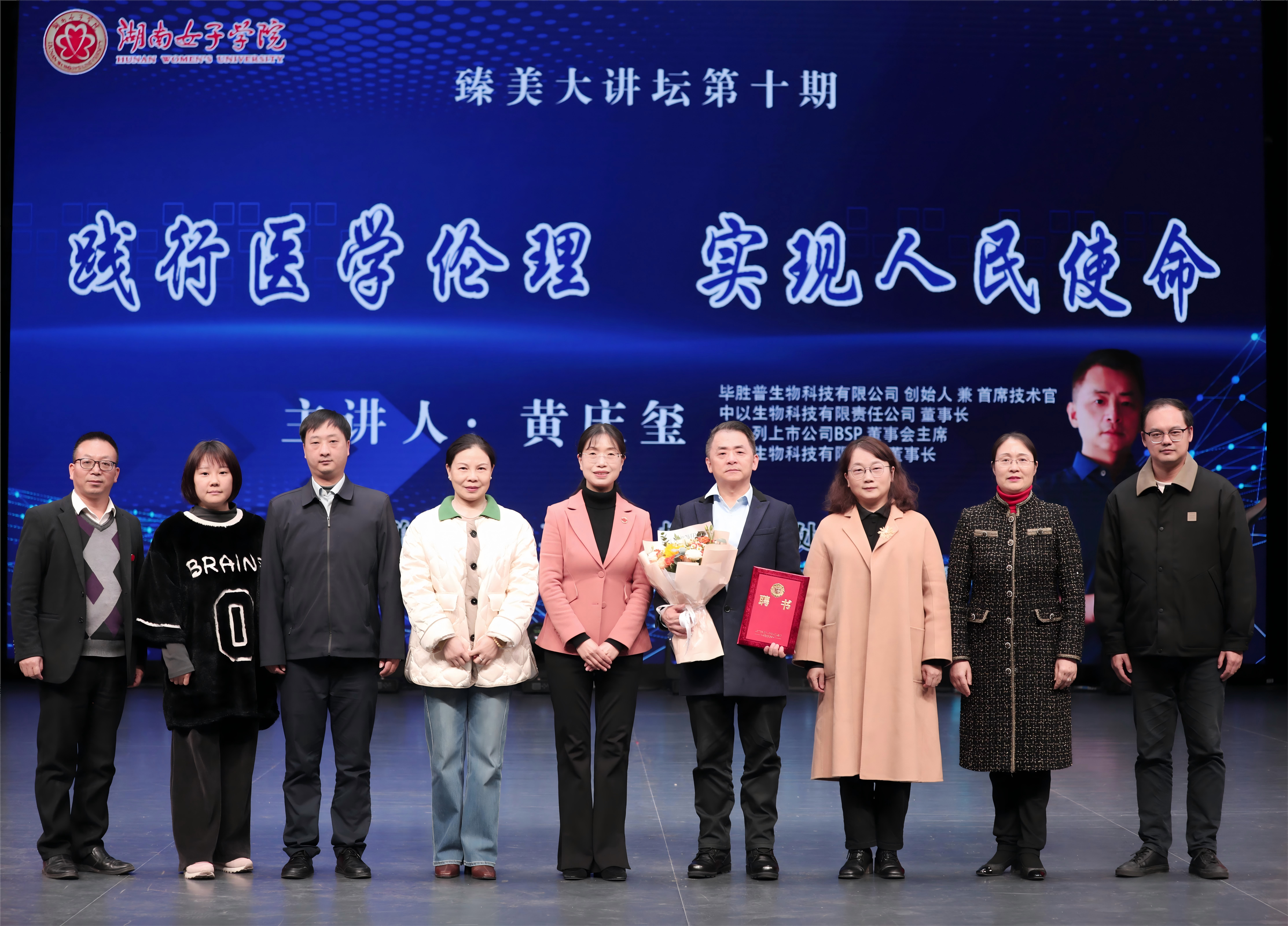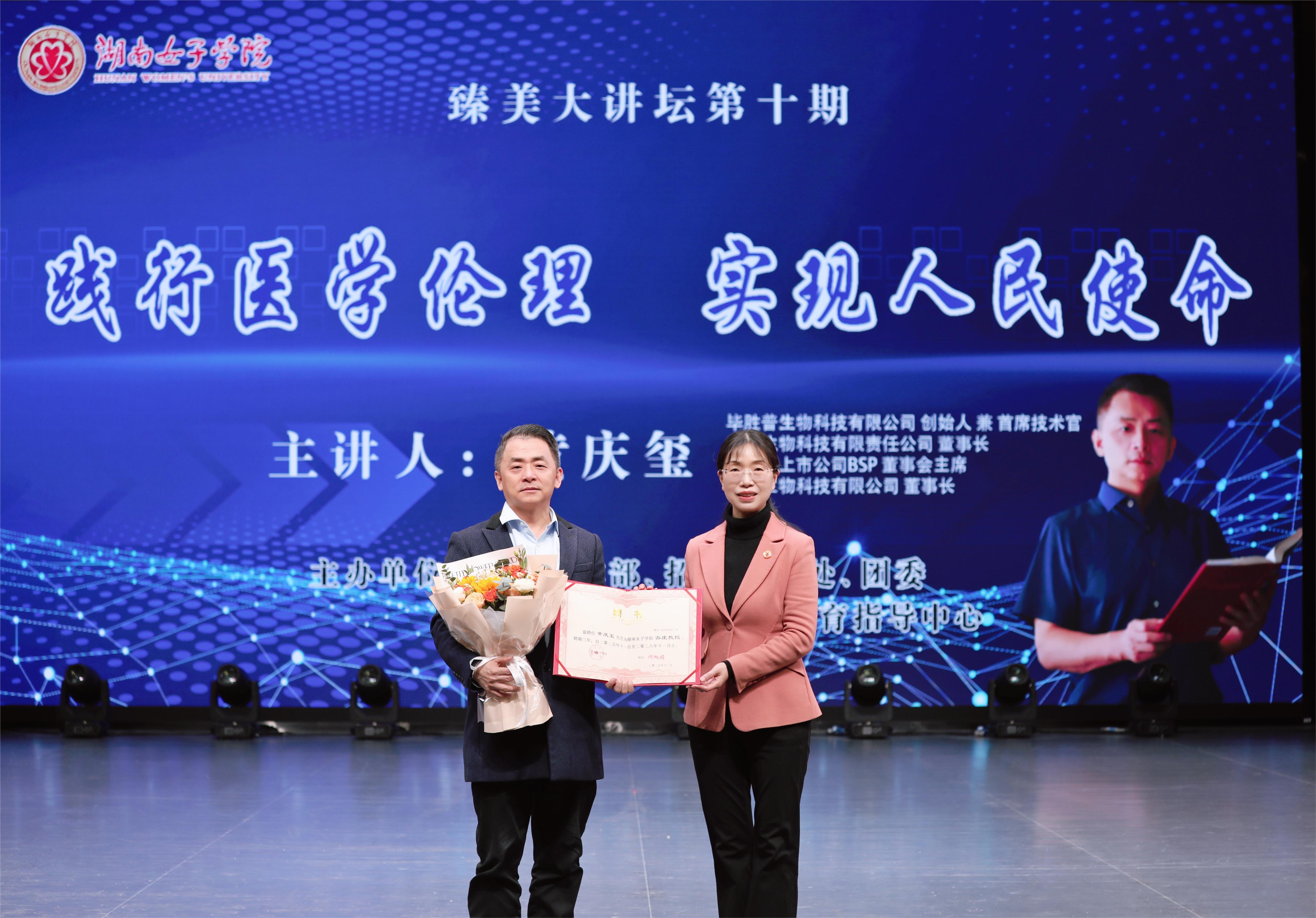 本网讯(学工部 朱晟 刘阳)11月18日下午,pg娱乐第十期“臻美大讲坛”在求实楼骄杨剧场举行,中国生物科技领域优秀企业家黄庆玺应邀来校作“践行医学伦理,实现人民使命”主题讲座。党委副书记、校长何旭娟出席并为黄庆玺颁发“客座教授”聘书。学生工作部、招生就业处、产教融合与创新创业教育指导中心、团委等相关职能部门负责人、各二级学院党委(党总支)副书记、全体辅导员及学生代表共800余人现场聆听报告。讲座由党委委员、副校长周艳红主持。