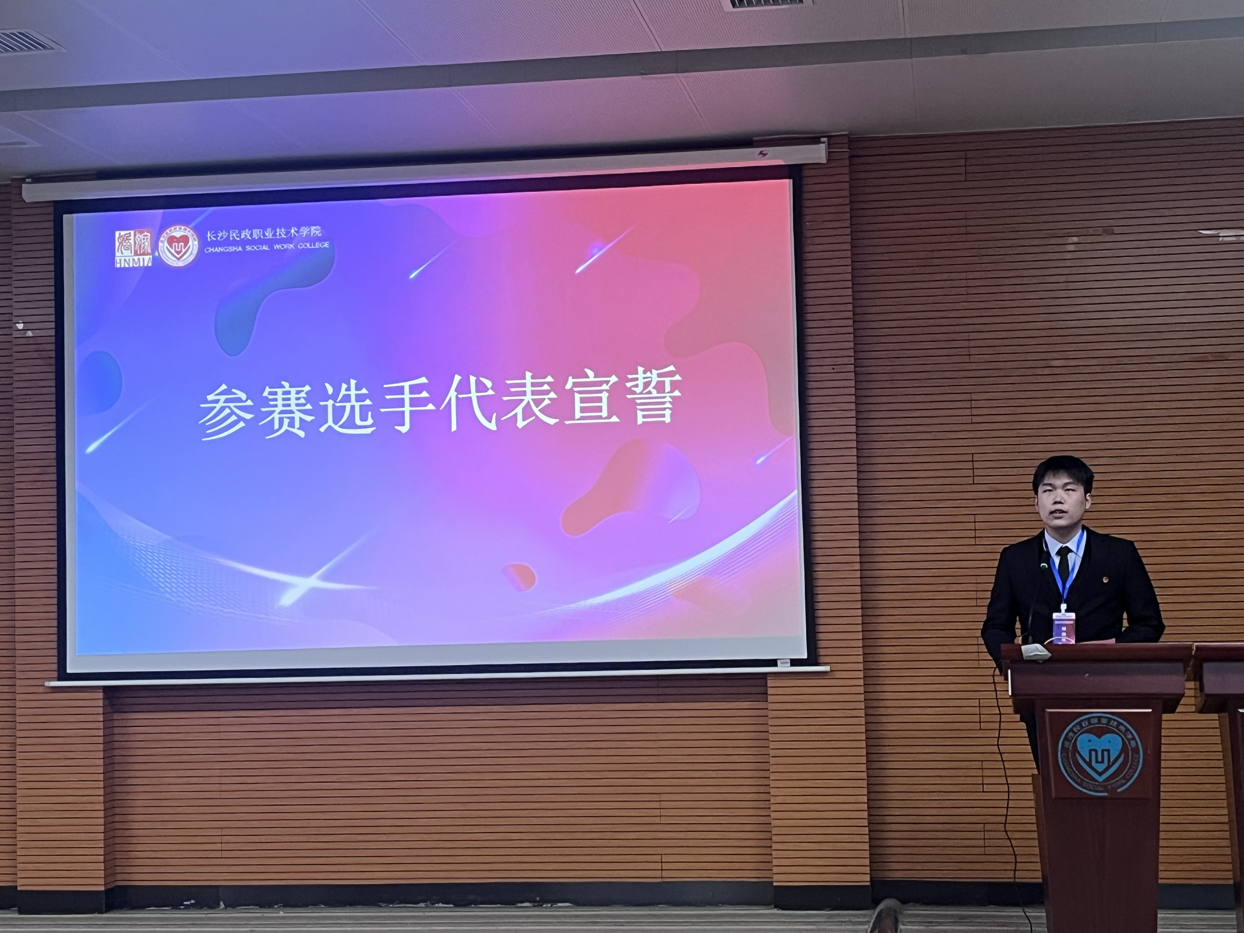 竞赛现场,高璟安同学作为参赛代表庄严宣誓,展现出pg娱乐学子严谨认真的参赛态度与良好精神风貌,并凭借扎实的专业功底、新颖的创意构思及出色的现场表现,在婚礼策划赛项中脱颖而出斩获一等奖。