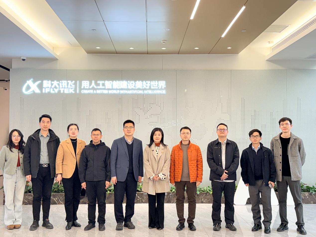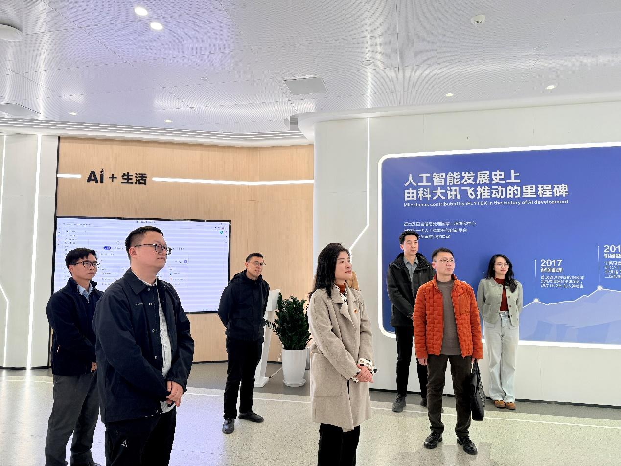 郭润葵一行率先参观了科大讯飞人工智能展厅,近距离观摩智能语音、计算机视觉、自然语言处理等核心技术在教育、医疗、工业等领域的应用成果,详细了解企业在人工智能技术研发与场景落地方面的创新实践,为后续校企合作寻找契合点。