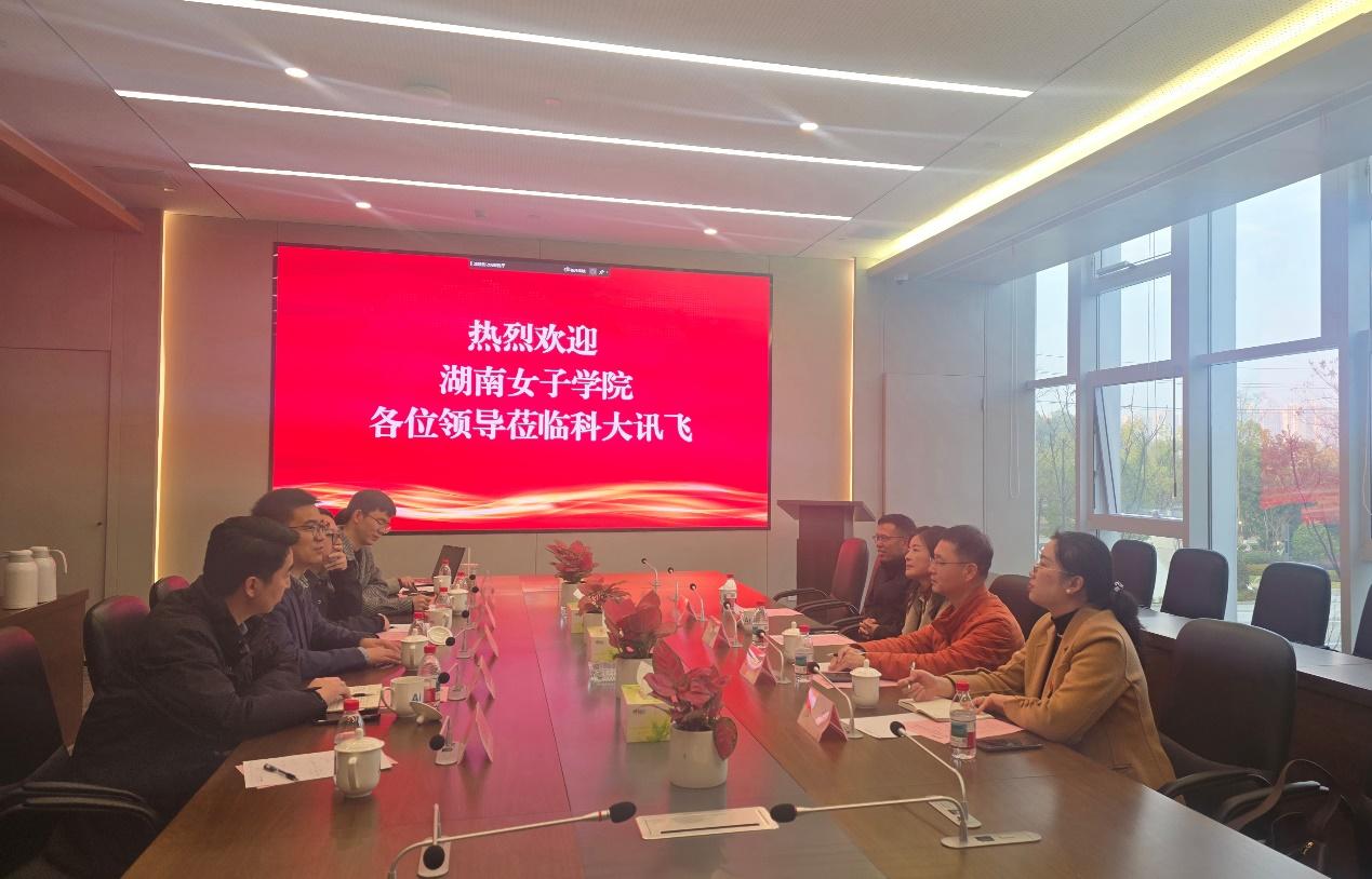 本网讯(信息科学与工程学院 廖宁)2025 年 12 月 18 日下午,学校党委委员、纪委书记郭润葵带队,信息科学与工程学院院长刘树锟、副院长蔡佐威、系主任廖宁一行赴科大讯飞中南总部开展考察交流,旨在深化产教融合、拓展校企合作新空间。科大讯飞湖南公司总经理王金生,高教行业总监秦隽皓、华中市场总监甘隽,华中售前咨询总监邓晋祥,实验室业务解决方案专家熊雁林及湖南公司高教行业区域总监周亚元热情接待并参与座谈。