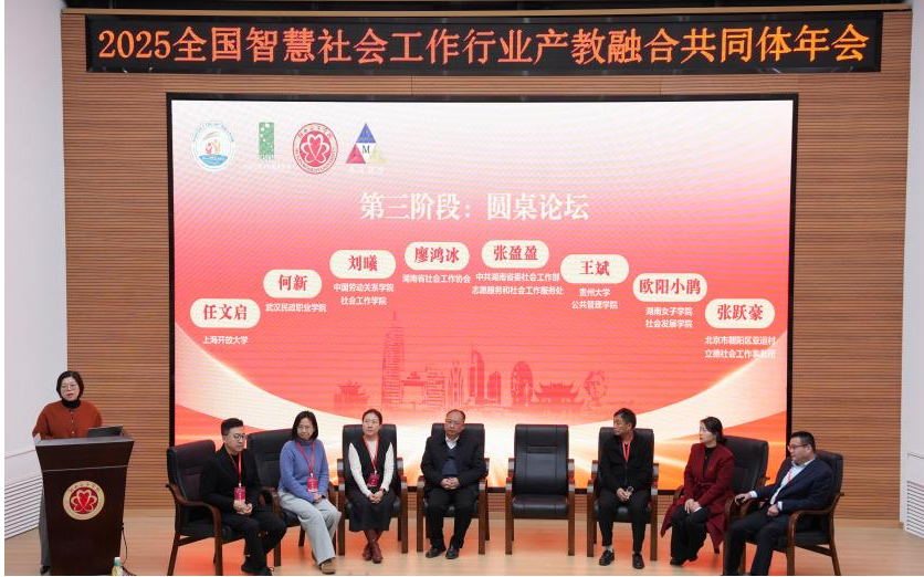 第三阶段,圆桌论坛环节聚焦“政行校企社”协同发展模式,由上海开放大学教授任文启主持。来自政府部门、行业协会、本科院校、职业院校、社工机构与企业界的多位代表,围绕人才培养、供需对接、科技赋能、实习实践等议题展开对话,共同探索构建开放、融合、可持续的行业生态。