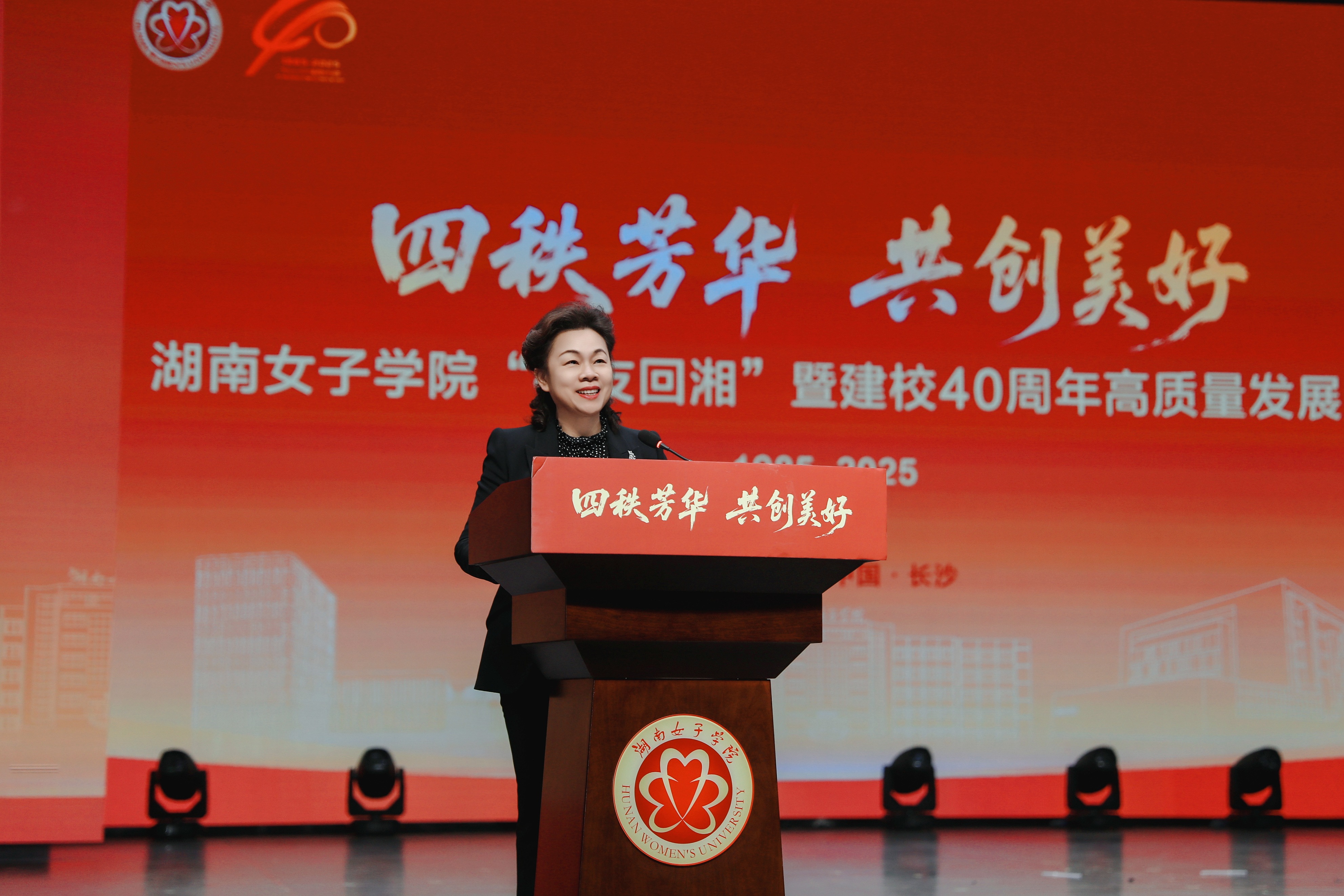 湖南省政协党组成员、副主席肖百灵深情回顾了与学校的深厚渊源,希望学校坚持立德树人,为强国建设、民族复兴伟业培养更多有担当作为的新时代女性;坚持服务大局,主动融入“三高四新”,落实省委“两优方案”,推动“校友回湘”延伸拓展,在服务我省经济社会高质量发展上彰显更大担当;坚持守正创新,建设高水平妇女发展智库,在推动妇女事业发展上贡献新的更大力量。