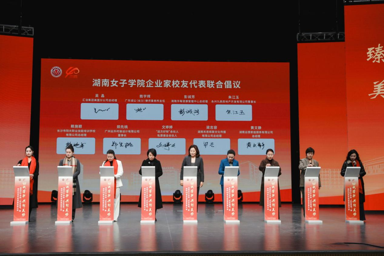 学校首届毕业生、汇洁集团美国分公司总经理吴晶代表校友表达对母校的感恩与祝福。现场,9名校友代表联合向广大校友发出“凝聚智慧力量、推进‘校友回湘’”的倡议,以实际行动“回湘创业、反哺母校”。
